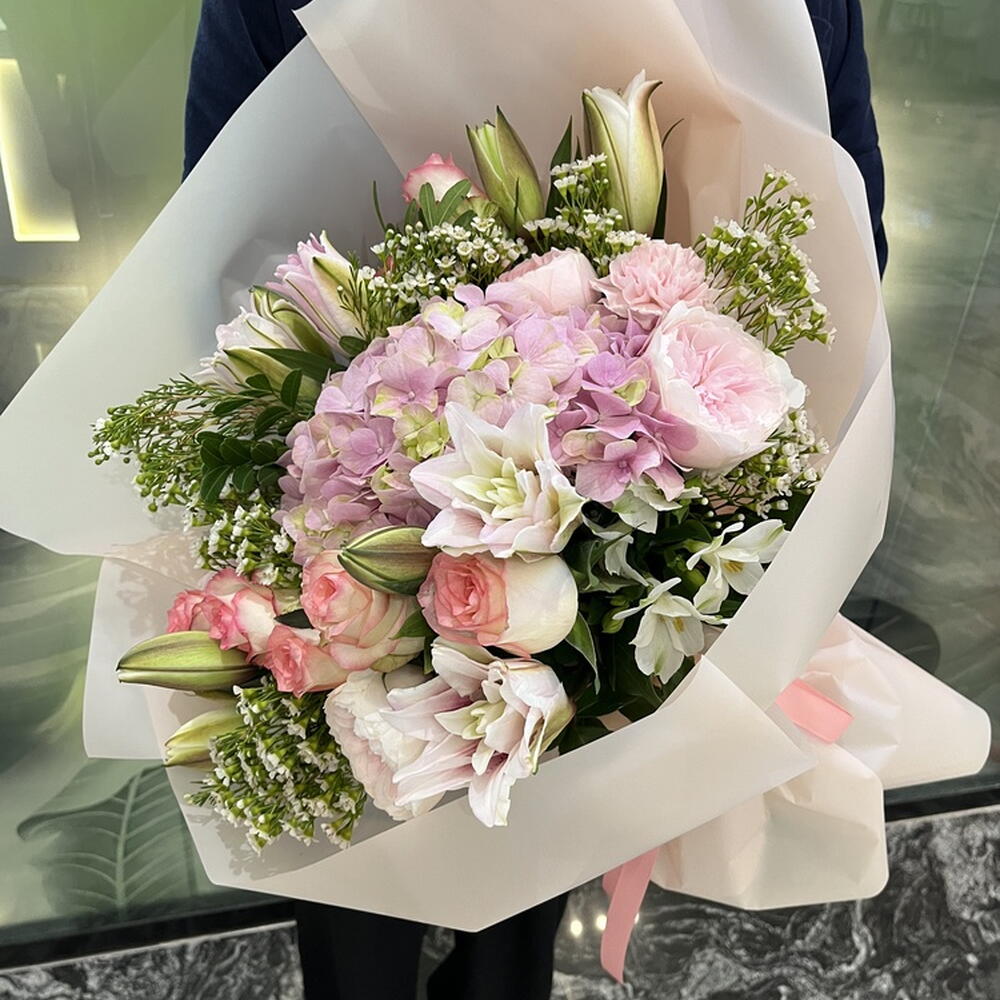 Hydrangea - 1 pcs Alstroemeria - 1 pcs Pistacia - 1 pcs dianthus mix - 2 pcs rose david austin - 3 pcs chamelacium - 2 pcs jumilia rose - 10 pcs lily double oriental - 4 pcs flower wrapping paper - 1 pcs