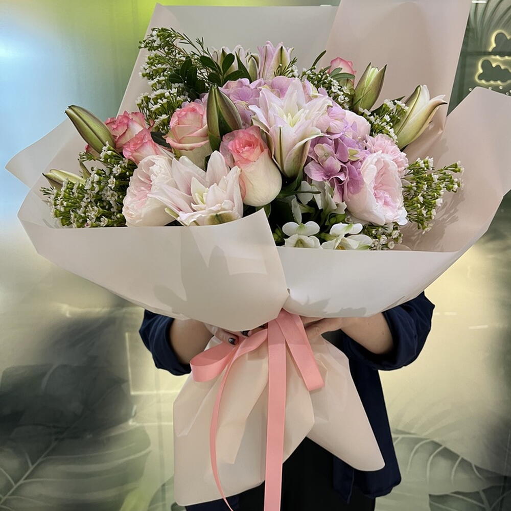 Composition: Alstroemeria - 1, Lily Double Oriental - 4, Chamelacium - 2, Hydrangea - 1, Jumilia rose - 10, Pistacia - 1, Rose David Austin - 3, Dianthus mix - 2, Flower Wrapping Paper - 1 Sizes: WIDTH - 55CM; HEIGHT - 65CM; LENGTH - 65CM; (including packaging) Size: 55 x 65 x 65 cm