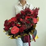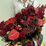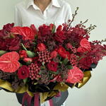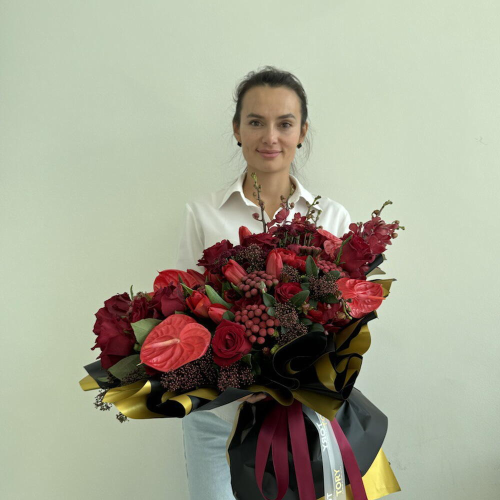 Composition: Anthurium - 5, Brunia - 5, Tulip - 40, Ranunculus - 20, Skimmia - 7, rose red - 20, orchid - 10, wrapping - 1, ribbon - 2 Sizes: WIDTH - 100CM; HEIGHT - 70CM; LENGTH - 70CM; (including packaging) Size: 100 x 70 x 70 cm