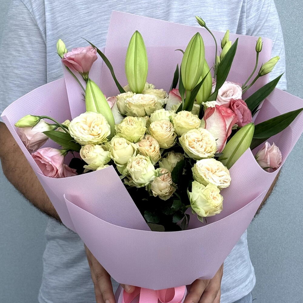 Composition: Lisianthus - 3, rose spray summerrose - 5, Jumilia rose - 4, Lily - 3, Wrapping Paper - 1, RIBBON - 1 Sizes: WIDTH - 40CM; HEIGHT - 60CM; LENGTH - 60CM; (including packaging) Size: 40 x 60 x 60 cm
