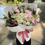Composition: Hydrangea - 1, Rose David Austin - 5, Lily Double Oriental - 5, Dianthus - 7, Dendrobium - 4, Alstroemeria - 7, Flower Wrapping Paper - 1 Sizes: WIDTH - 55CM; HEIGHT - 65CM; LENGTH - 65CM; (including packaging) Size: 55 x 65 x 65 cm