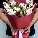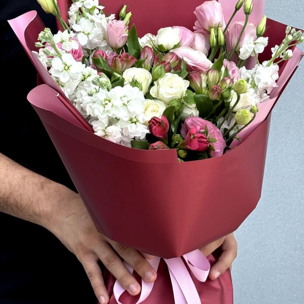 Composition: Mattiola - 4, Alstroemeria - 3, Lisianthus - 3, Spray Rose Snowy blossom - 2, Wrapping Paper - 1, RIBBON - 1 Sizes: WIDTH - 25CM; HEIGHT - 50CM; LENGTH - 50CM; (including packaging) Размер: 25 x 50 x 50 см