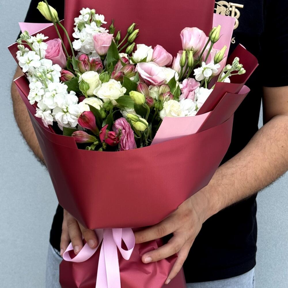 Composition: Mattiola - 4, Alstroemeria - 3, Lisianthus - 3, Spray Rose Snowy blossom - 2, Wrapping Paper - 1, RIBBON - 1 Sizes: WIDTH - 25CM; HEIGHT - 50CM; LENGTH - 50CM; (including packaging) Size: 25 x 50 x 50 cm