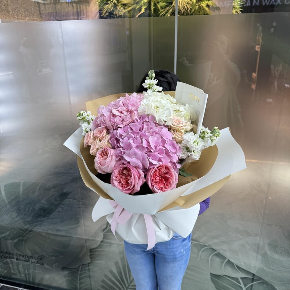 Composition: Hydrangea mix - 3, Rose spray import pink - 3, Rose Pink Expression - 3, Mattiola - 3 Sizes: WIDTH - 50CM; HEIGHT - 55CM; LENGTH - 55CM; (including packaging) Size: 50 x 55 x 55 cm