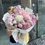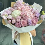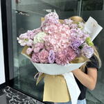 Composition: Hydrangea mix - 3, Mattiola - 5, Chrysanthemum Santini - 2, Dianthus - 5, Lisianthus - 3 Sizes: WIDTH - 60CM; HEIGHT - 65CM; LENGTH - 65CM; (including packaging) Size: 60 x 65 x 65 cm