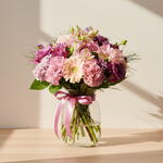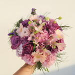 Vase - 1 pcs chrysanthemum single - 7 pcs purple rose - 5 pcs cornations - 5 pcs astromeria - 5 pcs