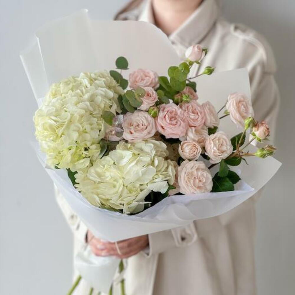 Introducing our elegant bouquet, a harmonious blend of white hydrangeas and delicate blush pink spray roses. This sophisticated arrangement is wrapped in paper, exuding a sense of grace and refinement. Perfect for weddings, anniversaries, or any special occasion, this bouquet brings a touch of timeless elegance to any setting.