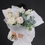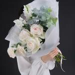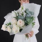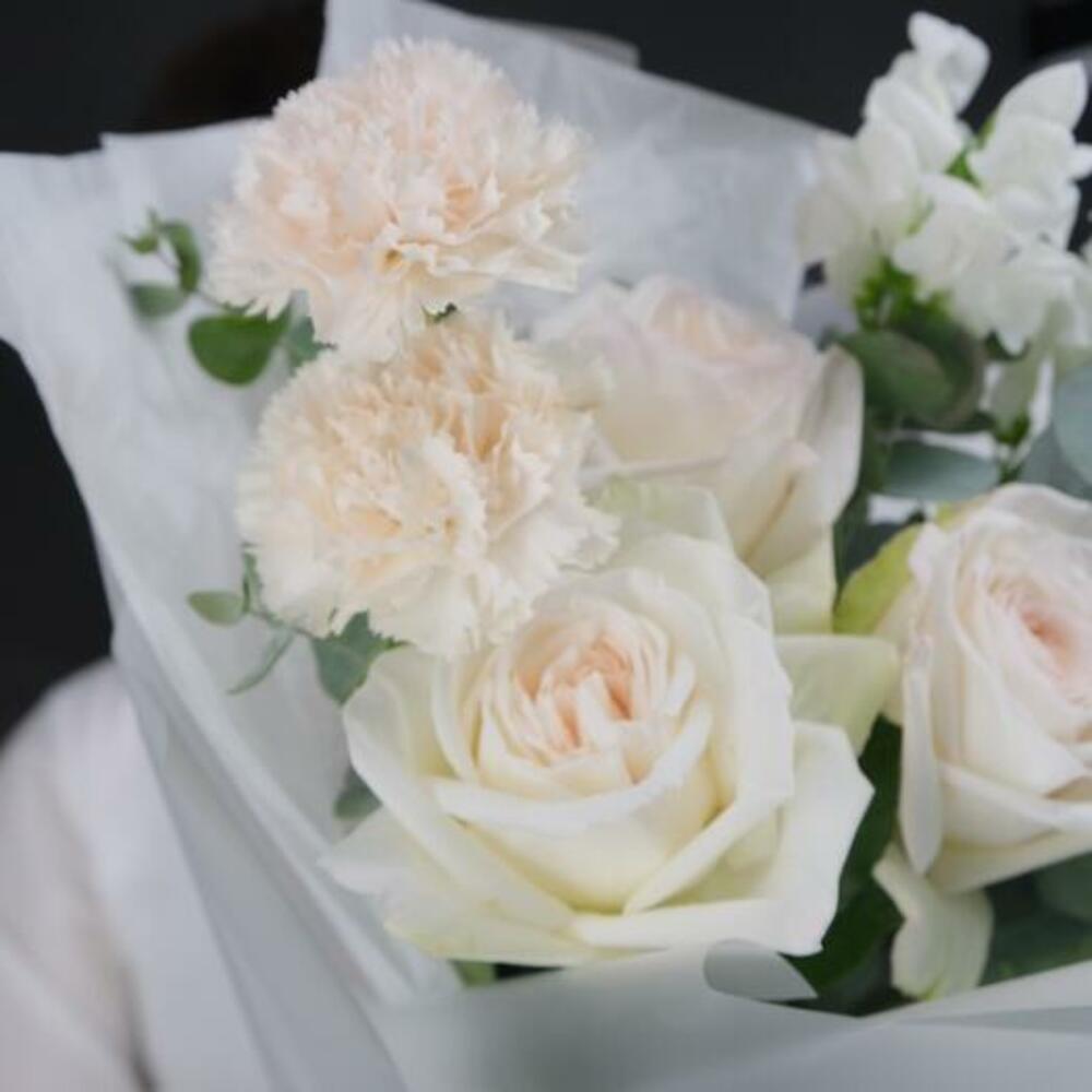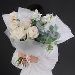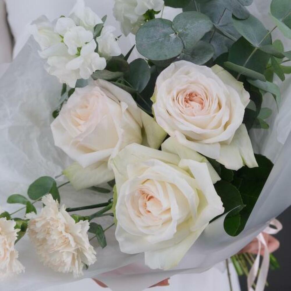 Eucalyptus - 3 pcs carnation - 2 pcs white mathiola - 2 pcs white ohara rose - 3 pcs