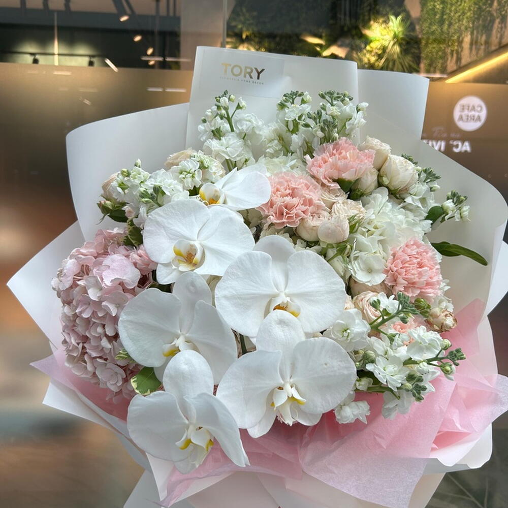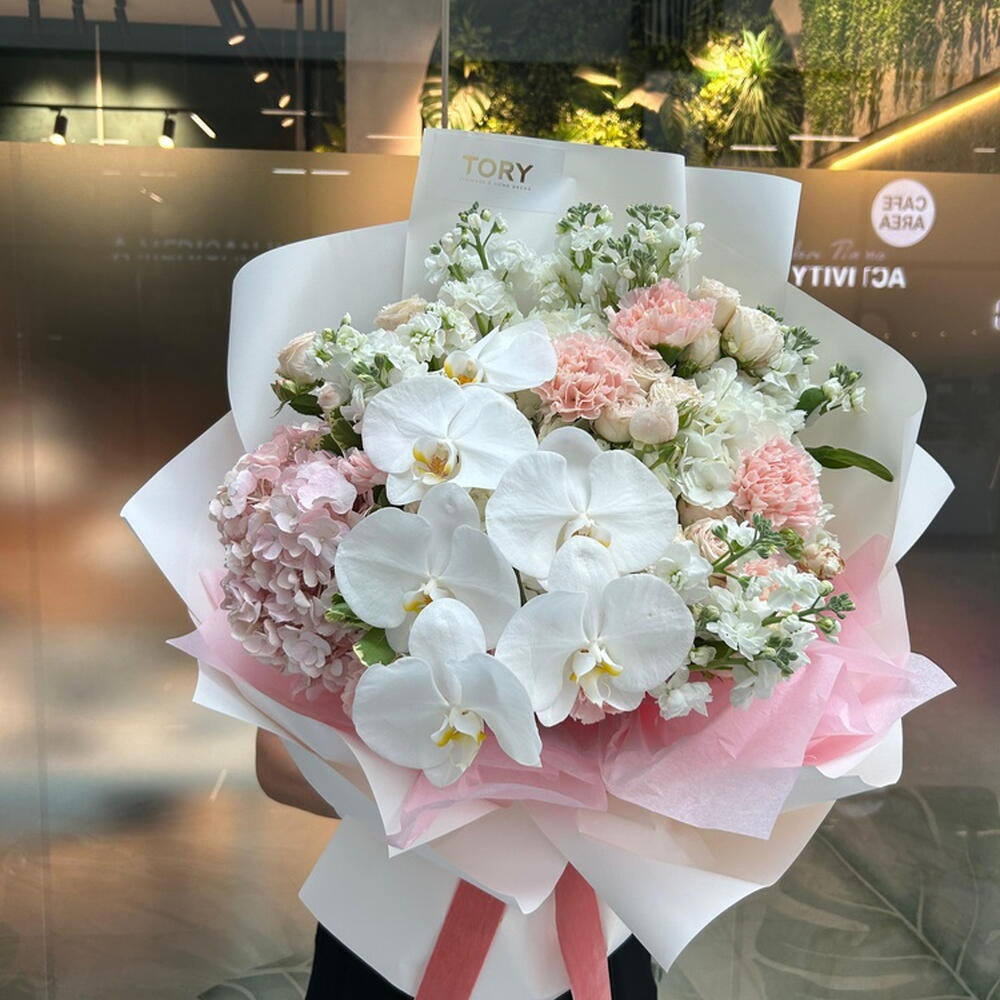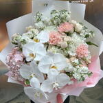 Composition: Phalaenopsis - 1, Dianthus - 9, Mattiola spray - 6, Rose spray Bombastic - 8, Hydrangea - 4, Pittosporum - 1 Sizes: WIDTH - 60CM; HEIGHT - 65CM; LENGTH - 65CM; (including packaging) Размер: 60 x 65 x 65 см