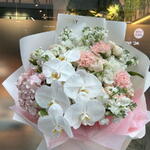 Composition: Phalaenopsis - 1, Dianthus - 9, Mattiola spray - 6, Rose spray Bombastic - 8, Hydrangea - 4, Pittosporum - 1 Sizes: WIDTH - 60CM; HEIGHT - 65CM; LENGTH - 65CM; (including packaging) Size: 60 x 65 x 65 cm