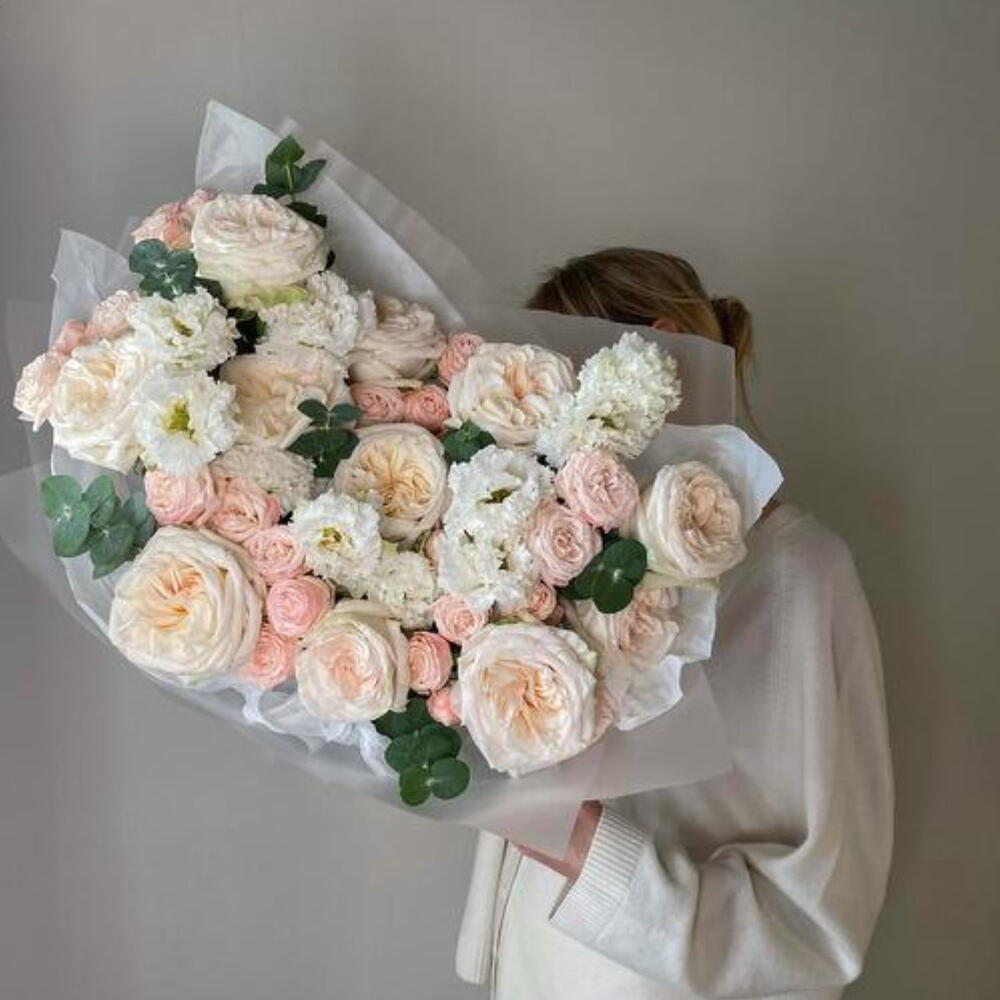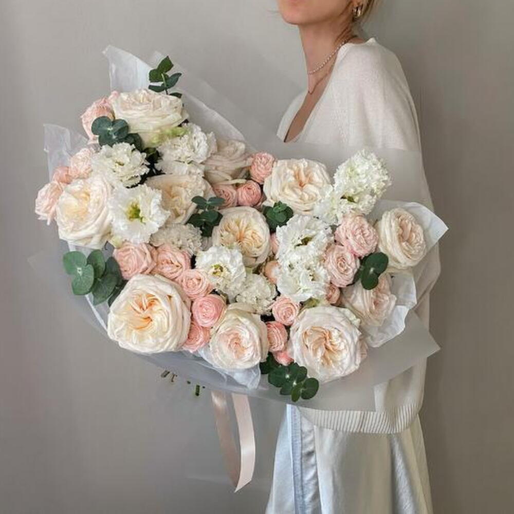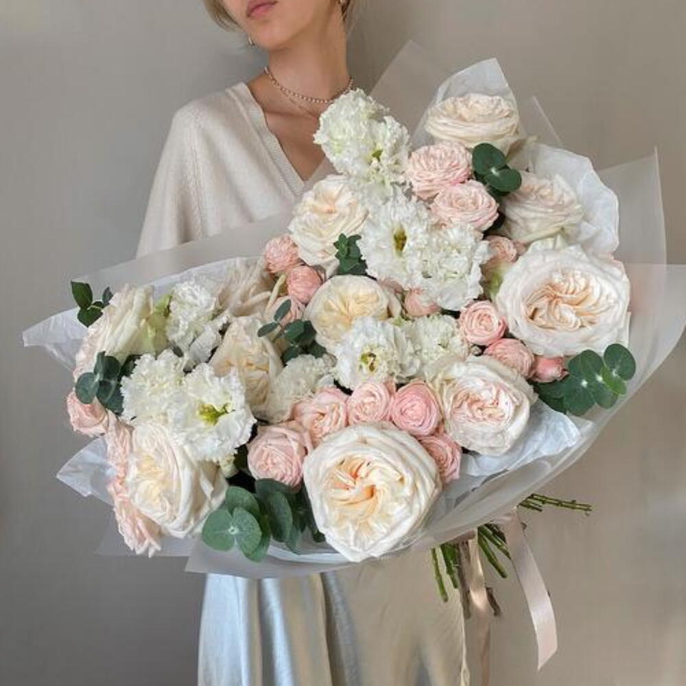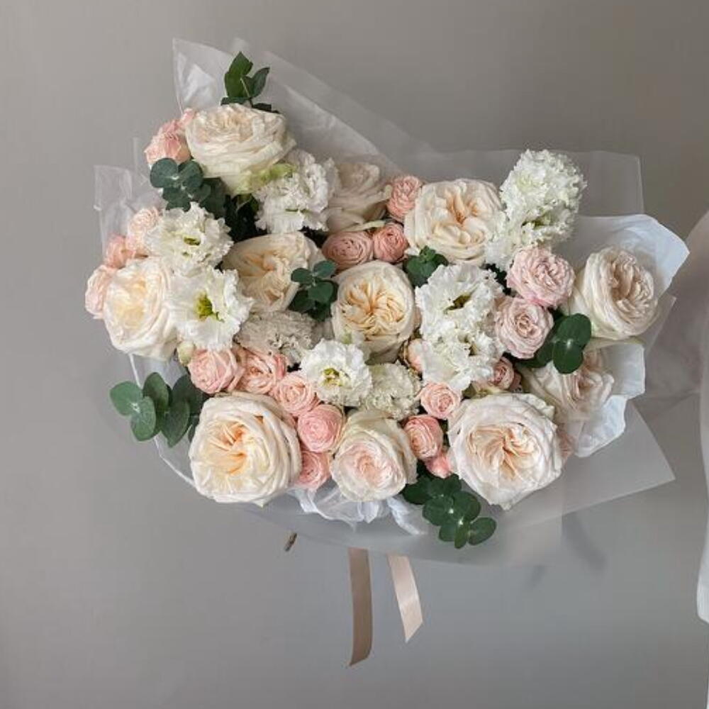 white lisianthus - 5 pcs white ohara - 10 pcs eucalyptus leaves - 3 pcs madam bombastic rose - 5 pcs transperant wrapping - 5 pcs white tissue paper - 3 pcs