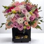 Delight someone special with this stunning Romantic Pastel Flower Box, a luxurious combination of fresh blooms and sweet indulgence. Beautifully arranged in a sleek black designer box, this floral arrangement features an enchanting blend of pink spray roses, lush purple roses, soft white lisianthus, delicate carnations, lilies, and more. Tucked into the drawer below is 200 grams of premium Belgian assorted chocolates, making it the perfect all-in-one gift for birthdays, anniversaries, Mother’s Day, or romantic surprises. Wrapped with a satin ribbon for an extra elegant touch, this arrangement is both a visual and flavorful treat. Care Instructions: To extend the life of your flower box, place it in a cool environment, away from direct sunlight and heat. Lightly mist the flowers with water once or twice a day to keep them fresh, but avoid soaking the base. Do not refrigerate the chocolates; keep them in a dry, cool drawer. Refrain from touching delicate petals and blooms to avoid bruising. This arrangement is designed to stay fresh and beautiful for several days with proper gentle care.