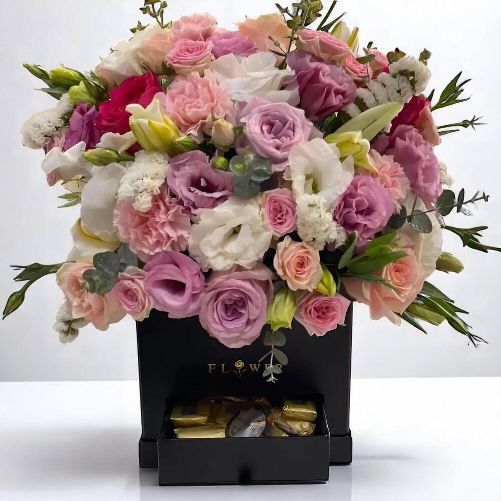 Delight someone special with this stunning Romantic Pastel Flower Box, a luxurious combination of fresh blooms and sweet indulgence. Beautifully arranged in a sleek black designer box, this floral arrangement features an enchanting blend of pink spray roses, lush purple roses, soft white lisianthus, delicate carnations, lilies, and more. Tucked into the drawer below is 200 grams of premium Belgian assorted chocolates, making it the perfect all-in-one gift for birthdays, anniversaries, Mother’s Day, or romantic surprises. Wrapped with a satin ribbon for an extra elegant touch, this arrangement is both a visual and flavorful treat. Care Instructions: To extend the life of your flower box, place it in a cool environment, away from direct sunlight and heat. Lightly mist the flowers with water once or twice a day to keep them fresh, but avoid soaking the base. Do not refrigerate the chocolates; keep them in a dry, cool drawer. Refrain from touching delicate petals and blooms to avoid bruising. This arrangement is designed to stay fresh and beautiful for several days with proper gentle care.