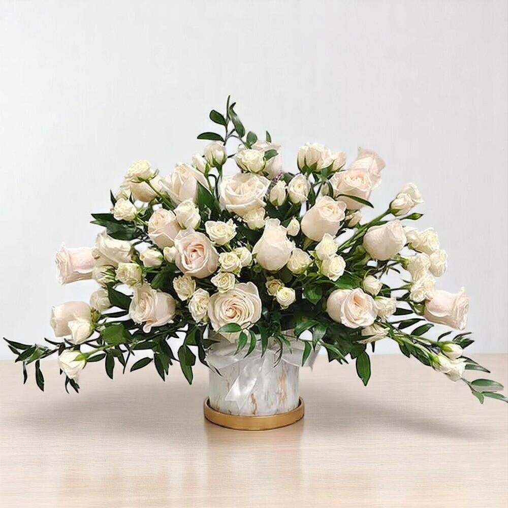 Indulge in the opulent beauty of our Snow White Roses arrangement, a flawless addition to elevate any ambiance. Bring joy to your beloved ones with this exquisite box of luxury.