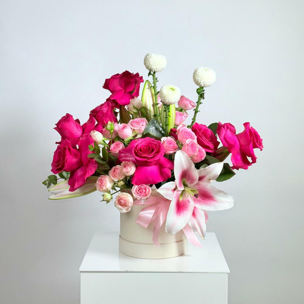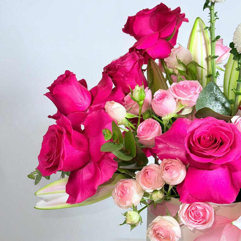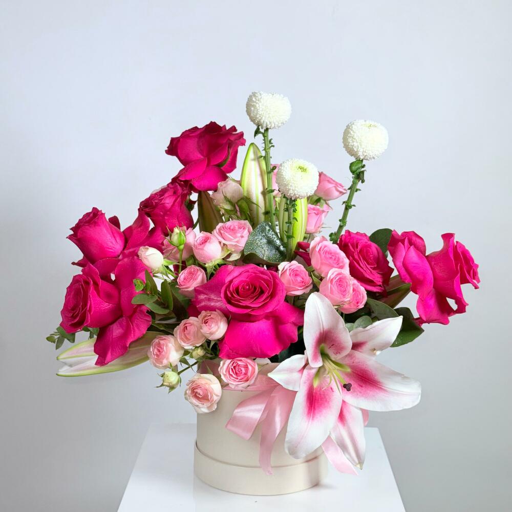 A stunning Birthday box arrangement designed in soft, romantic tones—perfect as a Birthday Bouquet and one of the best birthday bouquet choices for someone special. This mixed flowers bouquet / mix flowers bouquet is crafted with premium quality flowers and styled as elegant roses in a box, making it ideal for birthday flowers and unforgettable flowers for birthday moments. Flowers detected (included in the design): Hot Pink Roses (Rosa), Blush Pink Spray Roses (Rosa – spray), Pink Oriental Lily (Lilium), and White Ping Pong Chrysanthemums (Chrysanthemum). With its dreamy pastel color flowers feel (balanced with vibrant pinks), this fresh bouquet is also a beautiful congratulations bouquet, a romantic bouquet for love and romance, and a thoughtful pick for the best flowers for anniversary or best flowers for newborn celebrations. If you’re looking for a trending bouquet, unique flowers bouquet, and a premium flowers bouquet—this is a top choice for the best bouquet in Dubai.