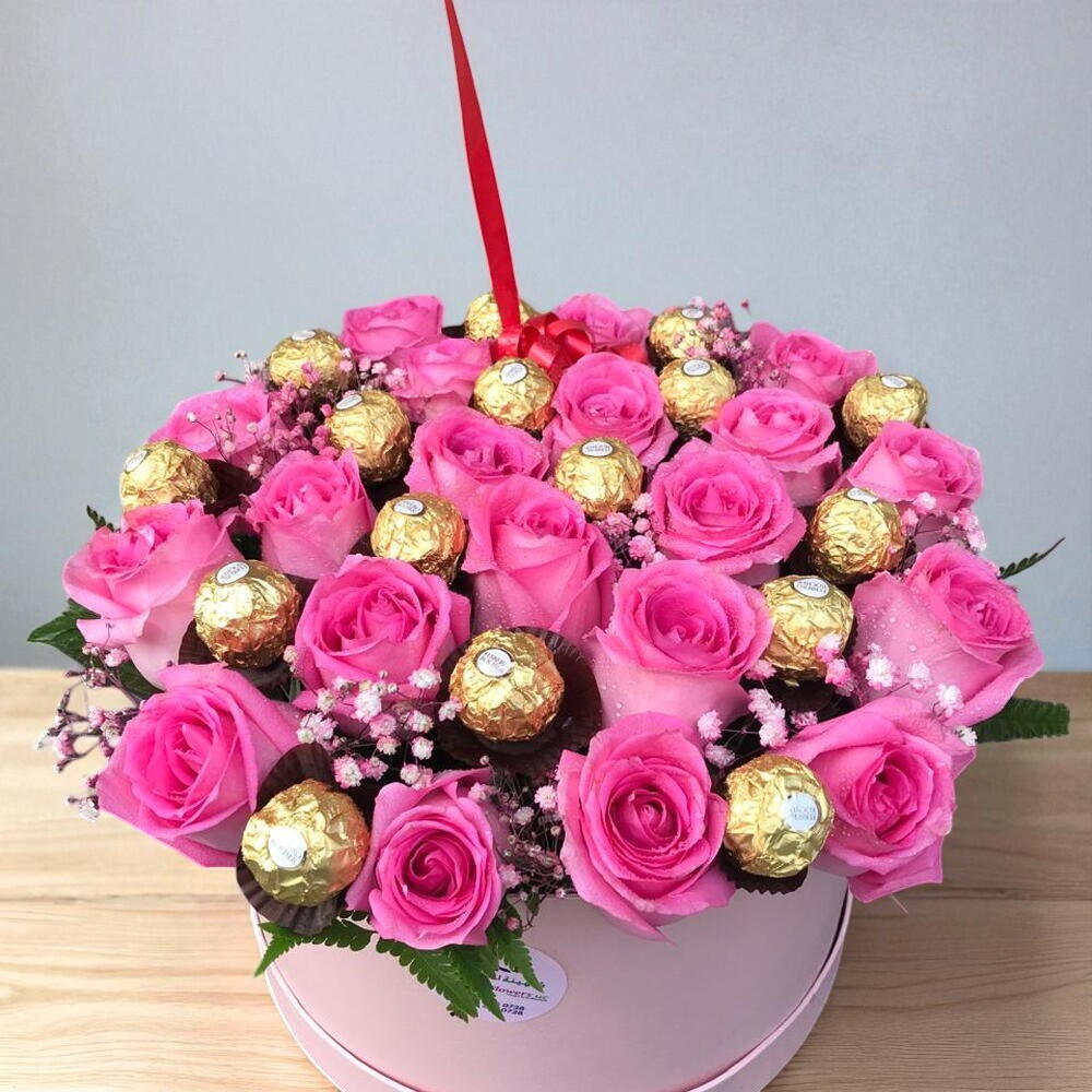 Indulge in the perfect blend of elegance and sweetness with our Box of Pink Roses with Ferrero Rocher Chocolate. This exquisite gift set includes 20 hand-picked, fresh pink roses and 16 pieces of delectable Ferrero Rocher chocolates, beautifully arranged to delight your loved ones. Key Features: Luxurious Gift Set: A stunning combination of 20 premium pink roses and 16 Ferrero Rocher chocolates. Fresh and Fragrant: Our roses are carefully selected to ensure they are fresh, vibrant, and fragrant. Perfect for Any Occasion: Ideal for birthdays, anniversaries, Valentine’s Day, Mother’s Day, or just to say I love you. Beautifully Packaged: Presented in an elegant box that enhances the aesthetic appeal and keeps the roses fresh.