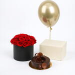 20 Red Rose, 1 Black Round Box, 2 Foam Oasis Local, 1 Shiny Gold Latex Balloon, 2 Gold Balloon Ribbon, Half Kg Chocolate Fudge Cake