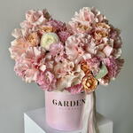 Romantic box of lush pink and peach roses with delicate accents, adorned with elegant pearls — a graceful gift full of tenderness and charm. Includes ranunculus, Juliet rose, O’hara rose, eustoma, Mondial rose. The set comes with a personalized card, care instructions and flower fertilizer. *Flower delivery today Perfect for: - a gift for her; - weddings or anniversaries; - birthday; - perfect dates; - gift add-ons; - baby showers; - the birth of a baby; - gifts with no occasion.