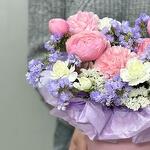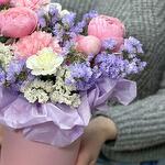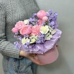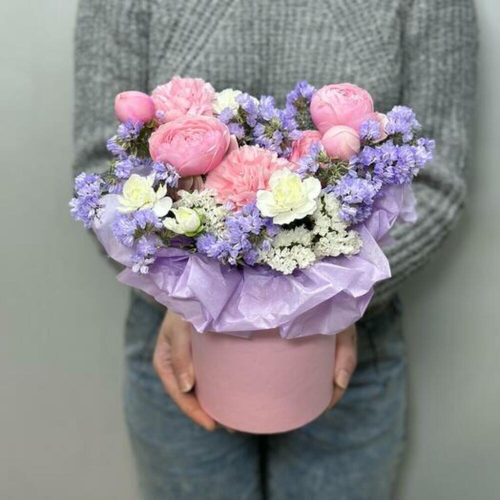carnation pink - 2 pcs floral oasis - 1 pcs white statice - 1 pcs lilac statice - 1 pcs white bush carnation - 1 pcs hatbox 12*12 - 1 pcs silva pink peony spray rose - 1 pcs