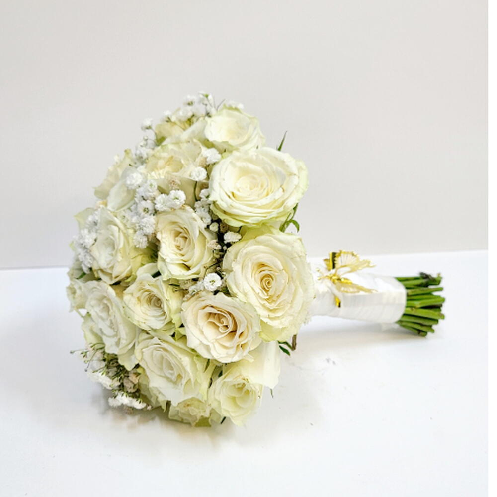 A graceful arrangement of 20 pristine white roses delicately paired with gypsophila — the perfect bouquet to celebrate love, purity, and the beauty of “I do.”
