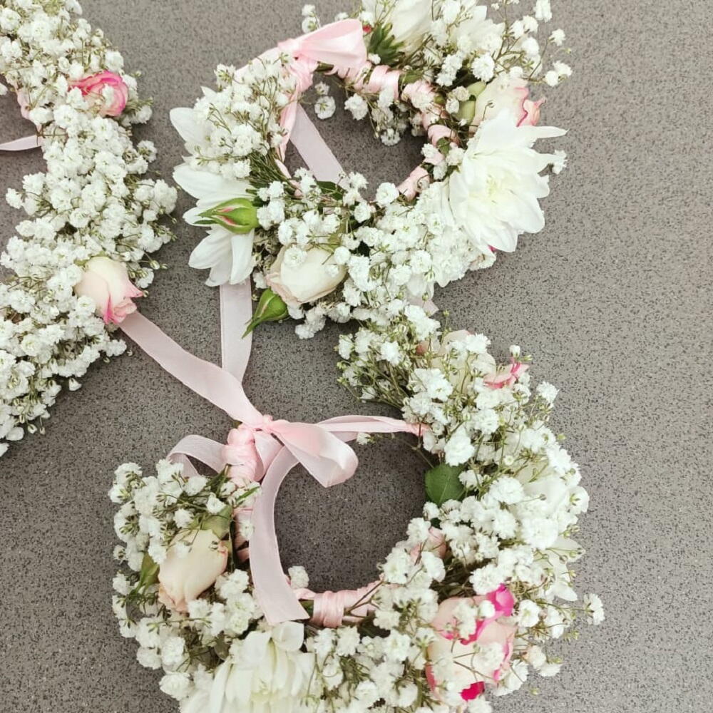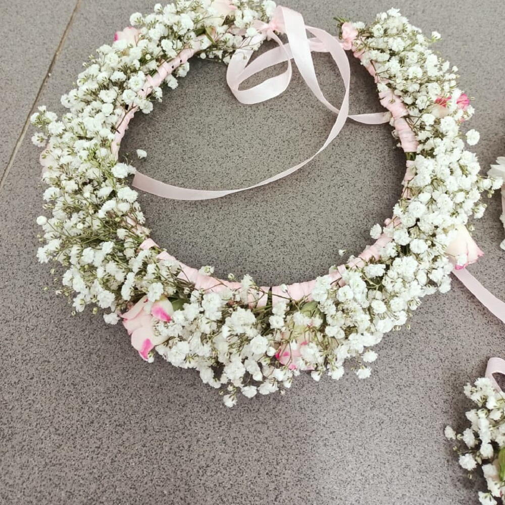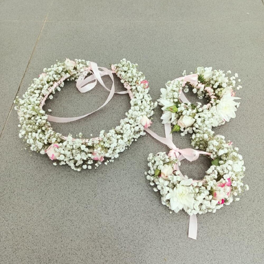 A matching floral accessory set featuring a full head wreath and two smaller wrist corsages, all handcrafted with delicate white babys breath, light pink ribbon ties, and subtle accents of small pink and white roses.