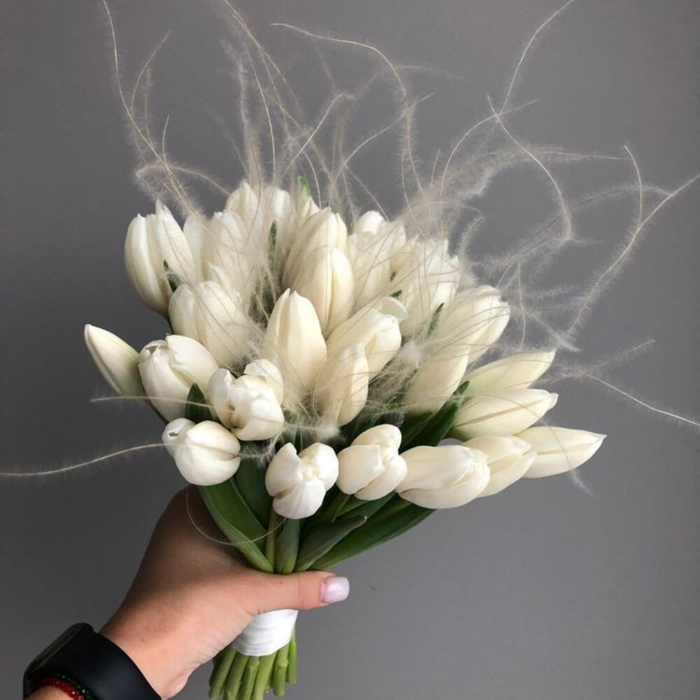 tulips white - 25 pcs rebbon - 1 pcs stiffa - 10 pcs box with water - 1 pcs
