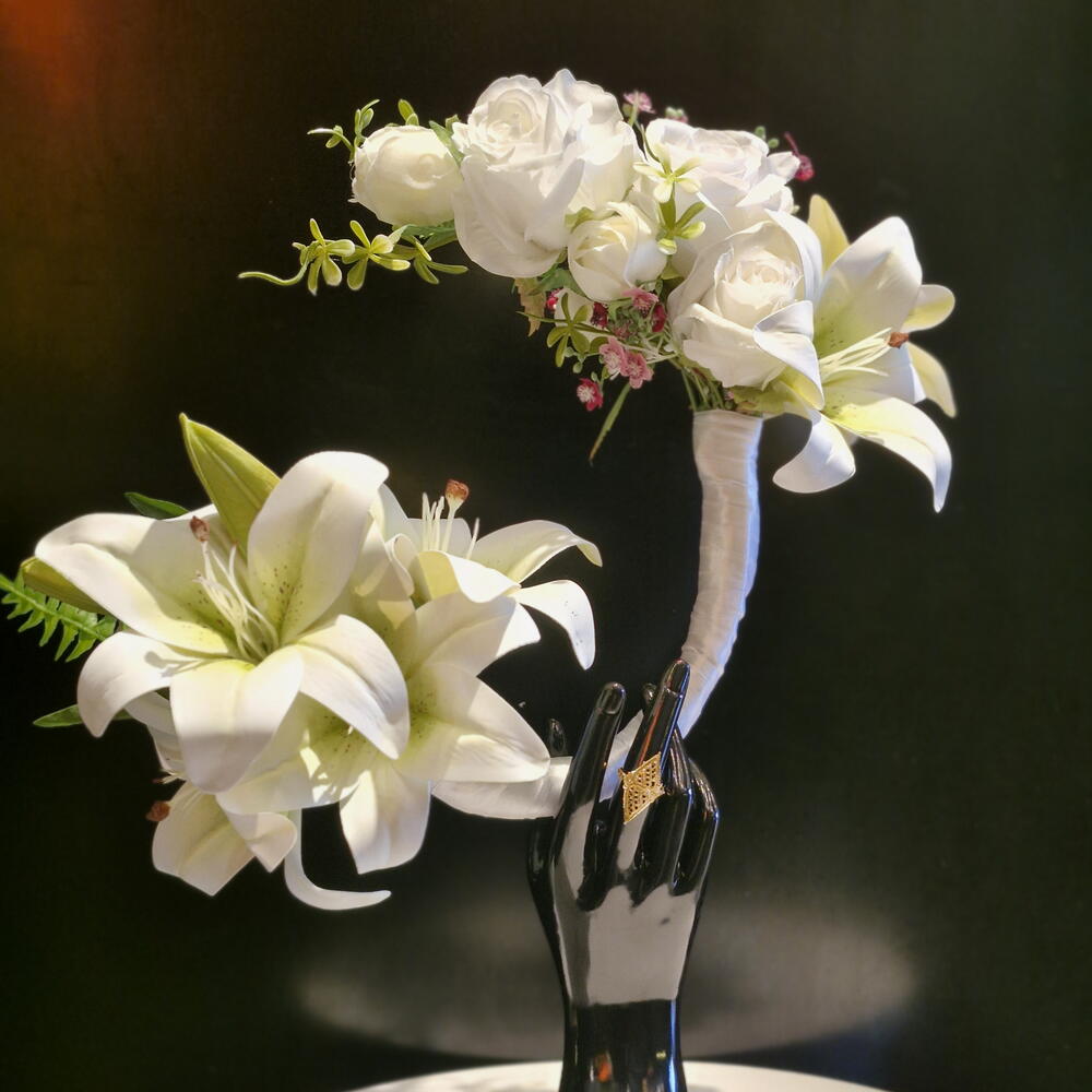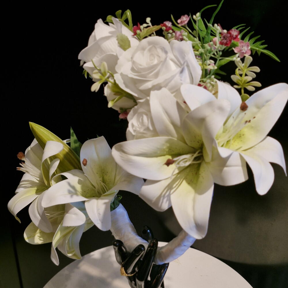 white lillies - 3 pcs white roses - 6 pcs black mannequin hand - 1 pcs