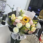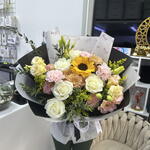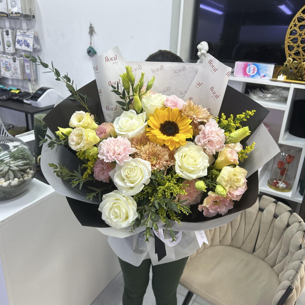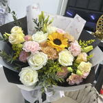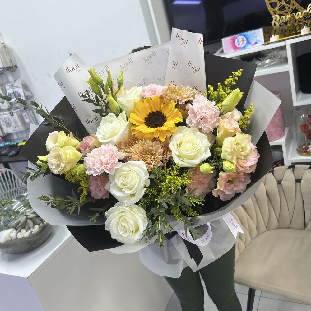 Solidago - 3 pcs Sunflower - 1 pcs white roses - 5 pcs peach lisianthus - 3 pcs parvifolia eucalyptus filler - 3 pcs peach chrysanthemums - 2 pcs
