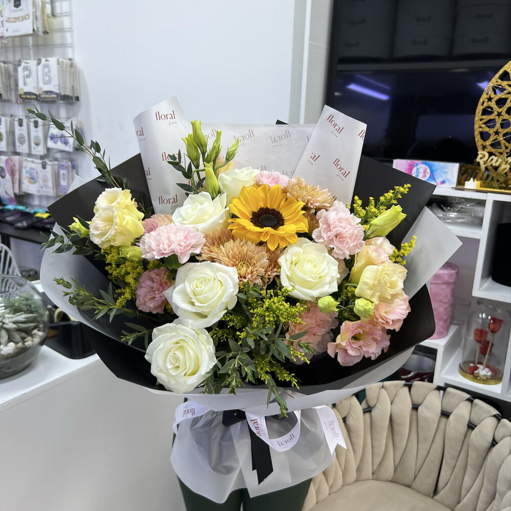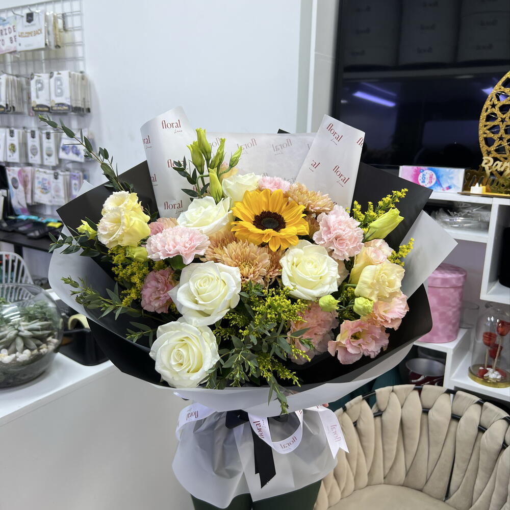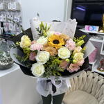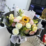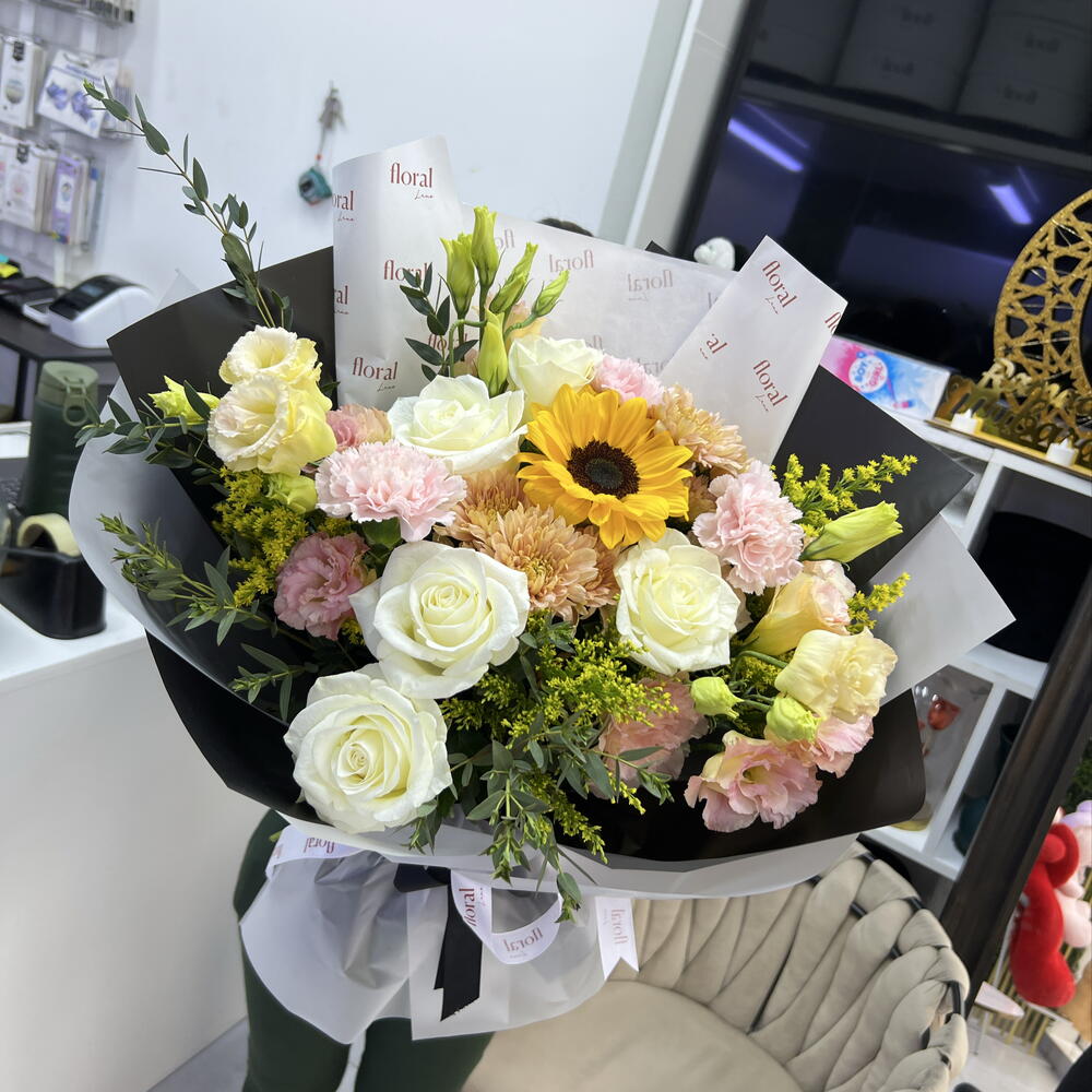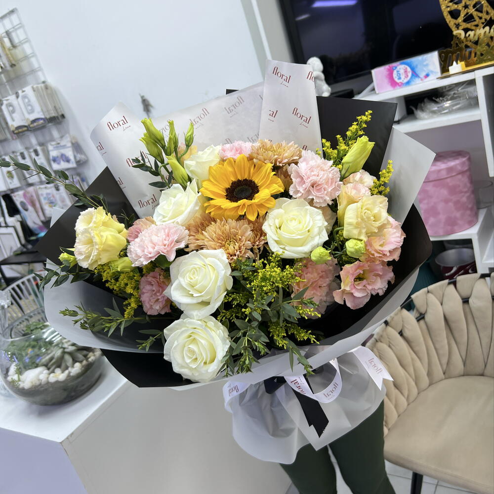 Solidago - 3 pcs Sunflower - 1 pcs pink carnations - 3 pcs white roses - 5 pcs peach lisianthus - 4 pcs parvifolia eucalyptus filler - 3 pcs peach chrysanthemums - 2 pcs