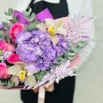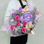 This delicate and elegant bouquet includes hydrangea, pink rose, fragrant mattiola, exquisite orchid, decorative fern and fresh eucalyptus. Such a bouquet will be a great gift for a special occasion. It is packed in stylish packaging and decorated with a ribbon, which makes it even more attractive and ready to be gifted.