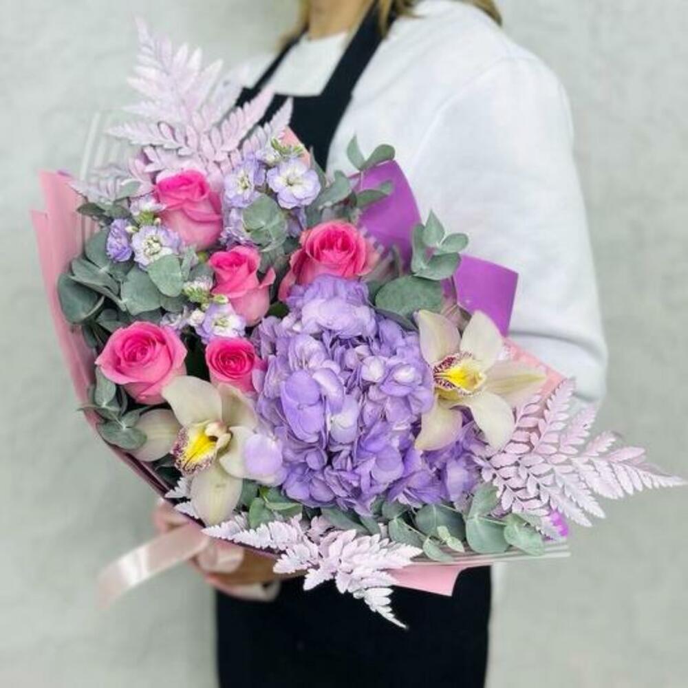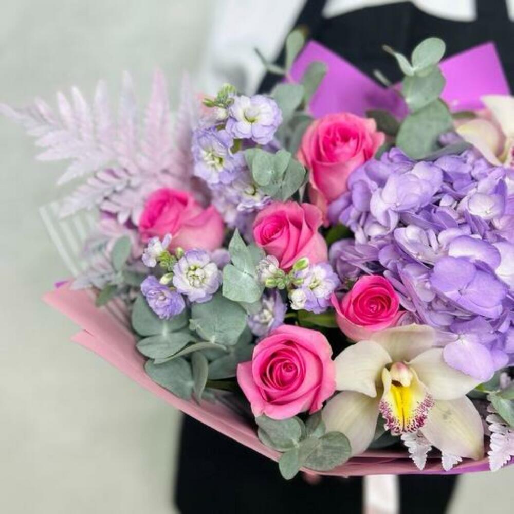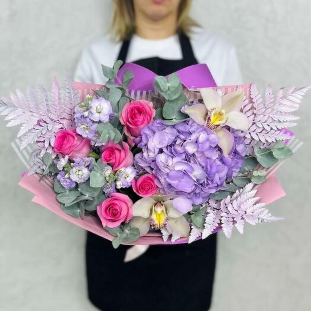 This delicate and elegant bouquet includes hydrangea, pink rose, fragrant mattiola, exquisite orchid, decorative fern and fresh eucalyptus. Such a bouquet will be a great gift for a special occasion. It is packed in stylish packaging and decorated with a ribbon, which makes it even more attractive and ready to be gifted.