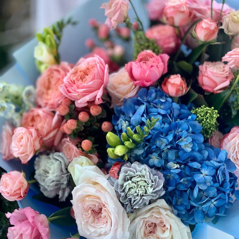Composition: Hydrangea - 1, Rose sprey Madame Bombastic - 4, Rose White Ohara - 2, Lisianthus - 1, Hypericum - 2, Freesia - 2, Delphinium - 1, Spray Rose Julieta peach - 1, Dianthus Space Dyed - 2, Skimmia - 1, wrapping - 6, ribbon - 1 Sizes: WIDTH - 45CM; HEIGHT - 60CM; LENGTH - 60CM; (including packaging) Размер: 45 x 60 x 60 см