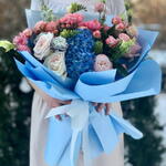 Ribbon - 1 pcs Hydrangea - 1 pcs Freesia - 2 pcs Lisianthus - 1 pcs Wrapping - 6 pcs hypericum - 2 pcs skimmia - 1 pcs delphinium - 1 pcs rose white ohara - 2 pcs spray rose julieta peach - 1 pcs rose sprey madame bombastic - 4 pcs dianthus space dyed - 2 pcs