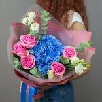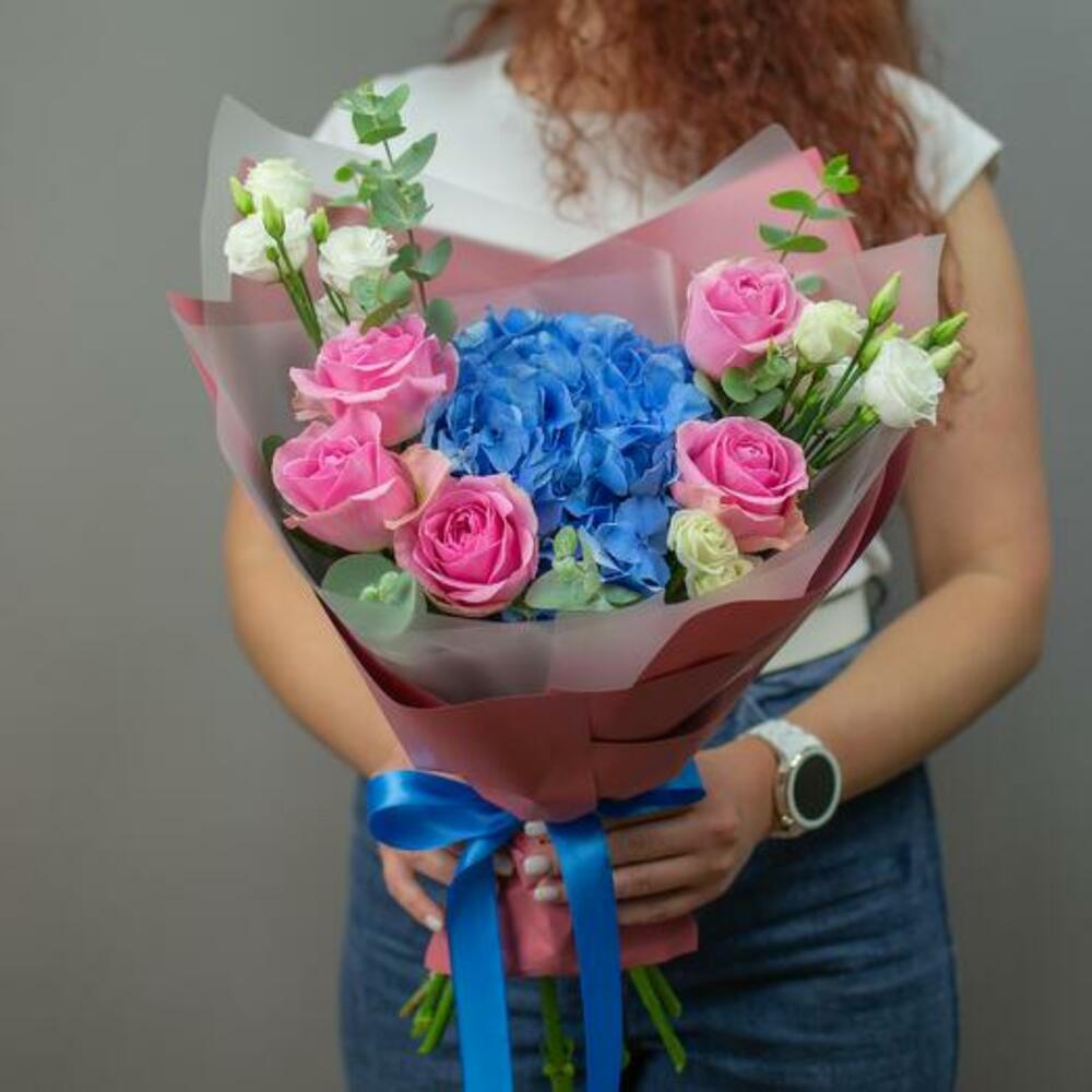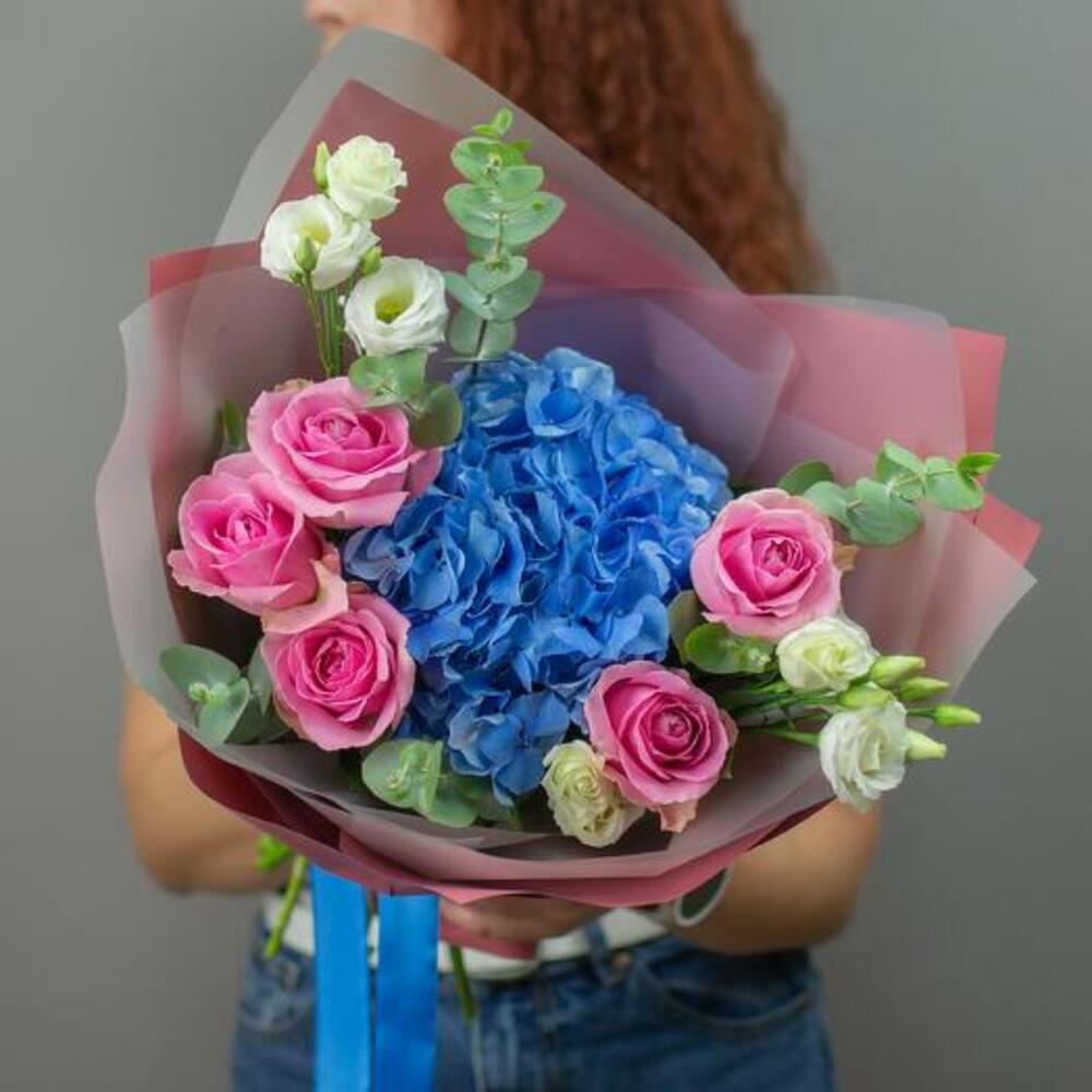 Bright bouquet of blue hydrangea, pink roses, white eustoma and eucalyptus sprigs is carefully packed in matte wrapping and tied with elegant ribbons.