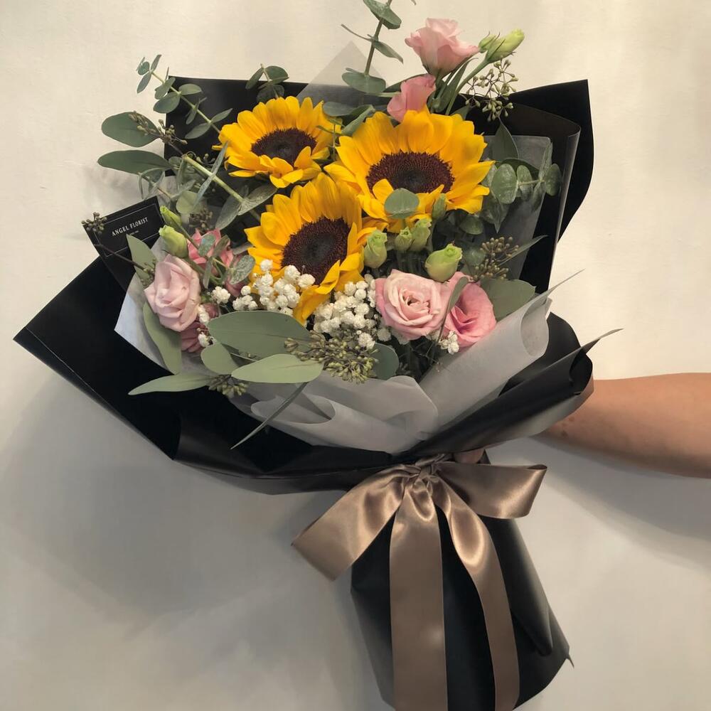 Sunflower - 3 pcs Gypsophila - 1 pcs pink lisianthus - 3 pcs warpping papper - 3 pcs eulcyptus - 3 pcs