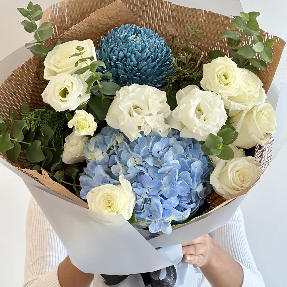 This exquisite bouquet brings together an elegant blend of soft and vibrant hues, creating a serene yet captivating arrangement. The cool, calming tones of blue hydrangea and blue peony chrysanthemum mingle harmoniously, exuding a sense of tranquility. Pure white proud roses lend a touch of grace and timeless beauty, while the delicate white eustoma adds an ethereal softness. Eucalyptus leaves complete the ensemble, introducing a refreshing burst of green and a gentle, aromatic finish. Together, these blooms form a sophisticated bouquet that’s perfect for moments of celebration or simply to bring a touch of elegance to any space.