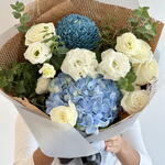 White rose - 5 pcs lisianthus white - 4 pcs blue hydrangea - 1 pcs eucalyptus leaves - 3 pcs peony chrysanthemum - 1 pcs