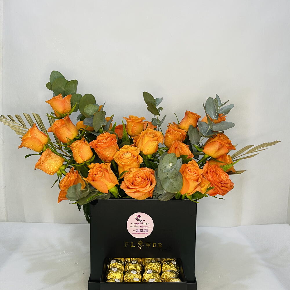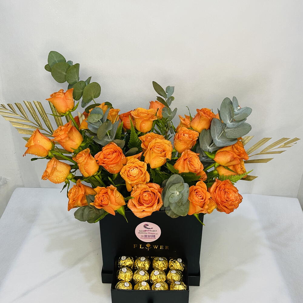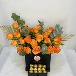 Delight in the luxurious charm of Bucket Love, an exquisite gift featuring 30 vibrant orange roses paired with 16 indulgent Ferrero Rocher chocolates, all elegantly presented in a sleek black box. This stunning combination of flowers and chocolates is perfect for expressing joy, admiration, and heartfelt sentiments on any special occasion. Key Features: Vibrant Orange Roses: 30 hand-picked orange roses, known for their radiant color and long-lasting freshness. Indulgent Ferrero Rocher: 16 delicious Ferrero Rocher chocolates, adding a touch of luxury and sweetness to the gift. Elegant Black Box: A sophisticated black box that enhances the overall presentation and makes for a memorable gift. Perfect for Any Occasion: Ideal for birthdays, anniversaries, celebrations, or simply to show someone special how much you care. Combination of Elegance and Delight: The vibrant roses and luxurious chocolates create a perfect harmony of beauty and taste. Why Choose Bucket Love? Symbolism: Orange roses symbolize enthusiasm, passion, and gratitude, making them an ideal choice for conveying joyful and heartfelt emotions. Luxurious Presentation: The sleek black box and the combination of vibrant roses and premium chocolates create a visually stunning and elegant gift. Freshness Guaranteed: Each rose is carefully selected for its freshness and longevity, ensuring the bouquet remains vibrant and beautiful. Thoughtful Design: The inclusion of Ferrero Rocher chocolates adds a delightful element of surprise and indulgence.