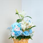 Welcome a new bundle of joy with this charming basket arrangement! Featuring pure white lilies and soft blue roses, this floral design is perfect for celebrating a baby boys arrival. A cuddly blue teddy bear adds a sweet touch, making it a delightful gift for a newborn or a baby shower. The delicate arrangement of blooms and the adorable plush toy come together to create a heartfelt and memorable gesture, perfect for expressing your love and best wishes to the family. Gift Details: White Lillies Astilbe Gypsophila Ruscus Rose Basket