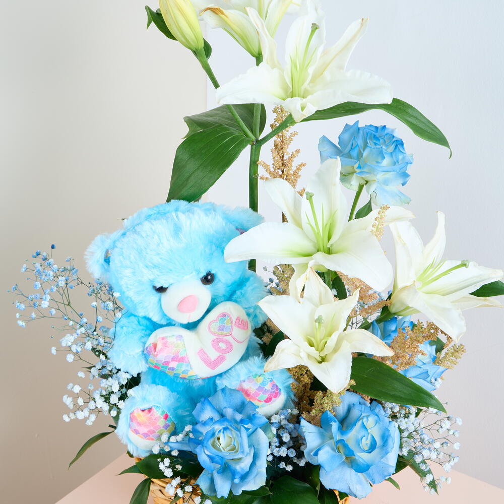 Welcome a new bundle of joy with this charming basket arrangement! Featuring pure white lilies and soft blue roses, this floral design is perfect for celebrating a baby boys arrival. A cuddly blue teddy bear adds a sweet touch, making it a delightful gift for a newborn or a baby shower. The delicate arrangement of blooms and the adorable plush toy come together to create a heartfelt and memorable gesture, perfect for expressing your love and best wishes to the family. Gift Details: White Lillies Astilbe Gypsophila Ruscus Rose Basket