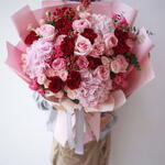 4 Pink Hydrangea,7 Pink Ohara Roses,7 Pink Roses,5 Red Roses,3 Red Spray Roses,3 Pink Spray Roses,5 Red Hypericum,5 Pink Astilbe,2 Stem Eucalyptus Beautifully Wrapped in Pink.