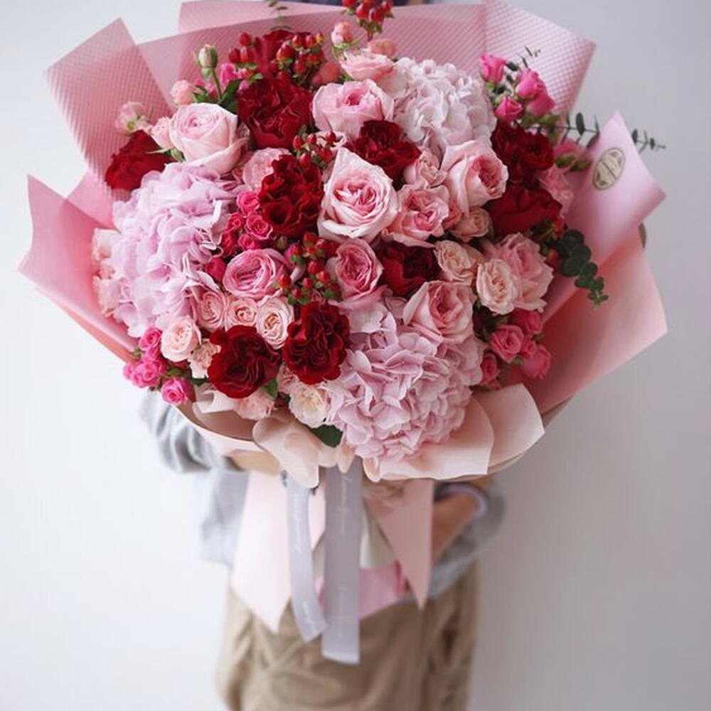 4 Pink Hydrangea,7 Pink Ohara Roses,7 Pink Roses,5 Red Roses,3 Red Spray Roses,3 Pink Spray Roses,5 Red Hypericum,5 Pink Astilbe,2 Stem Eucalyptus Beautifully Wrapped in Pink.