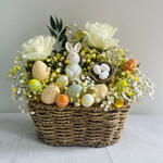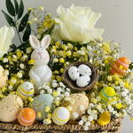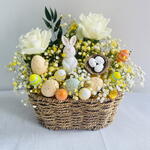 white roses - 2 pcs yellow sprayed gypsophila - 2 pcs toy rabbit - 1 pcs nest - 1 pcs mixed-colour easter eggs - 10 pcs