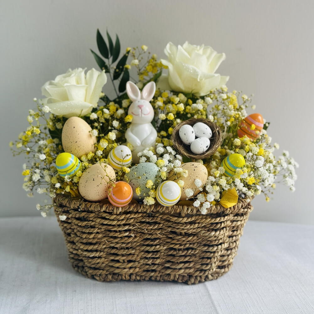 Celebrate Easter with our adorable Bunny Nest Easter Basket, beautifully arranged with a charming toy rabbit, 2 stems of yellow sprayed gypsophila, 2 elegant white roses, and 10 mixed Easter eggs, including eggs nestled in a decorative nest, all presented in a lovely basket. This sweet and festive arrangement brings a perfect touch of spring joy, making it an ideal gift for loved ones, kids, or Easter home décor. 🐰🥚🌼✨