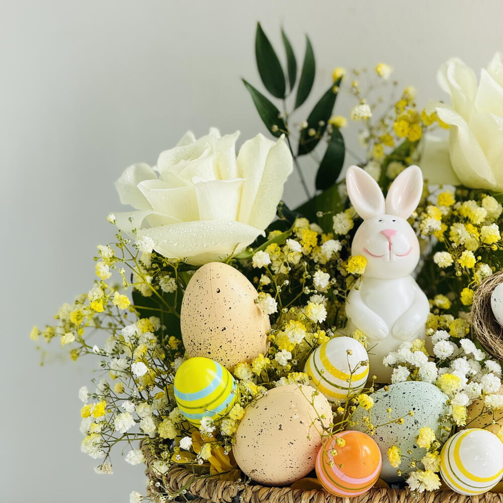 white roses - 2 pcs yellow sprayed gypsophila - 2 pcs toy rabbit - 1 pcs nest - 1 pcs mixed-colour easter eggs - 10 pcs