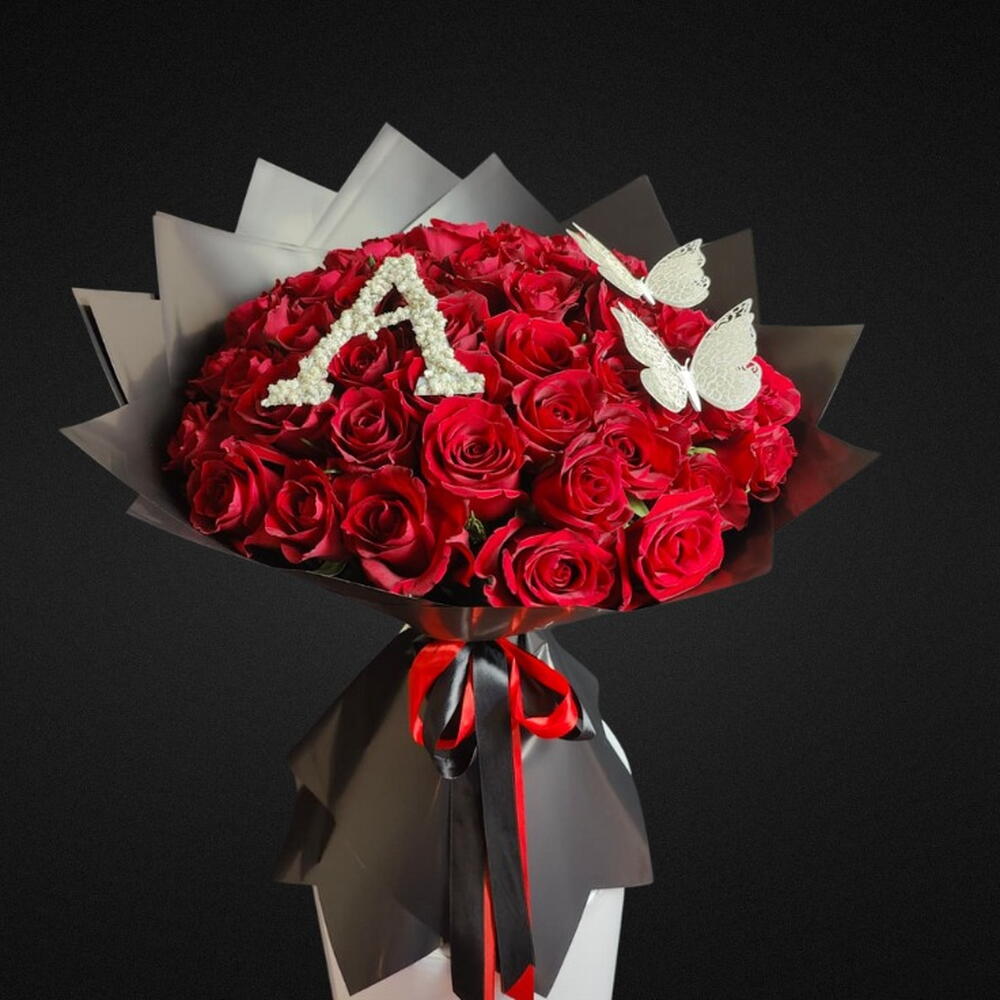Best gift for loving parson flower bouquet of 55 roses with custom name and butterfly, hand crafted black triangle wrapping.
