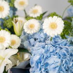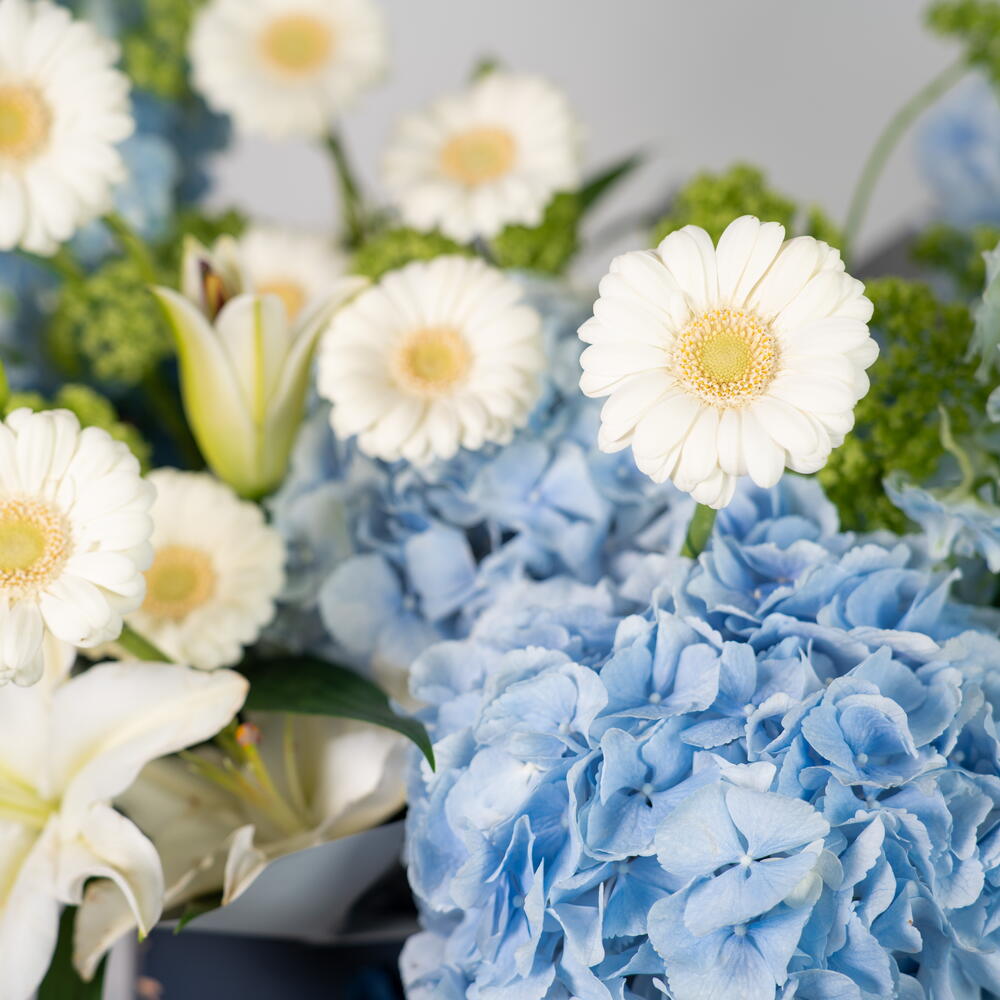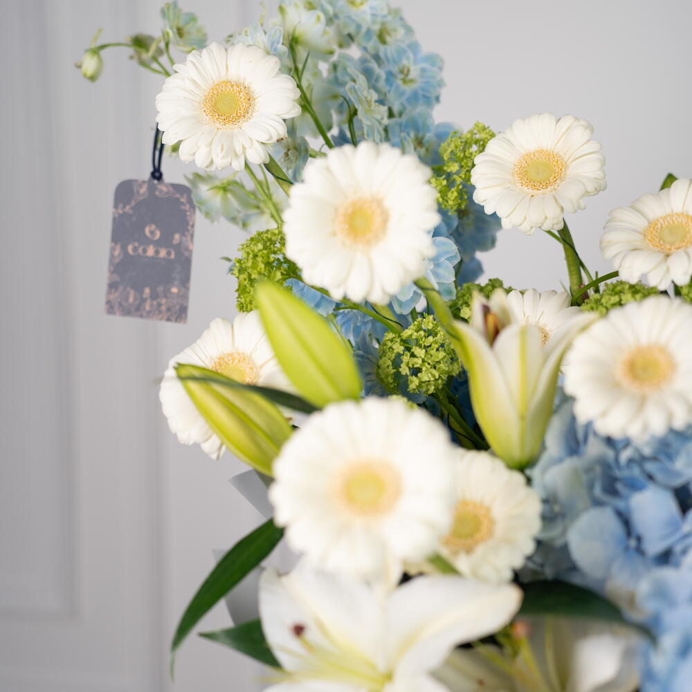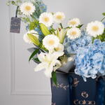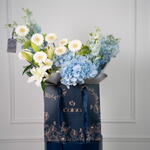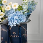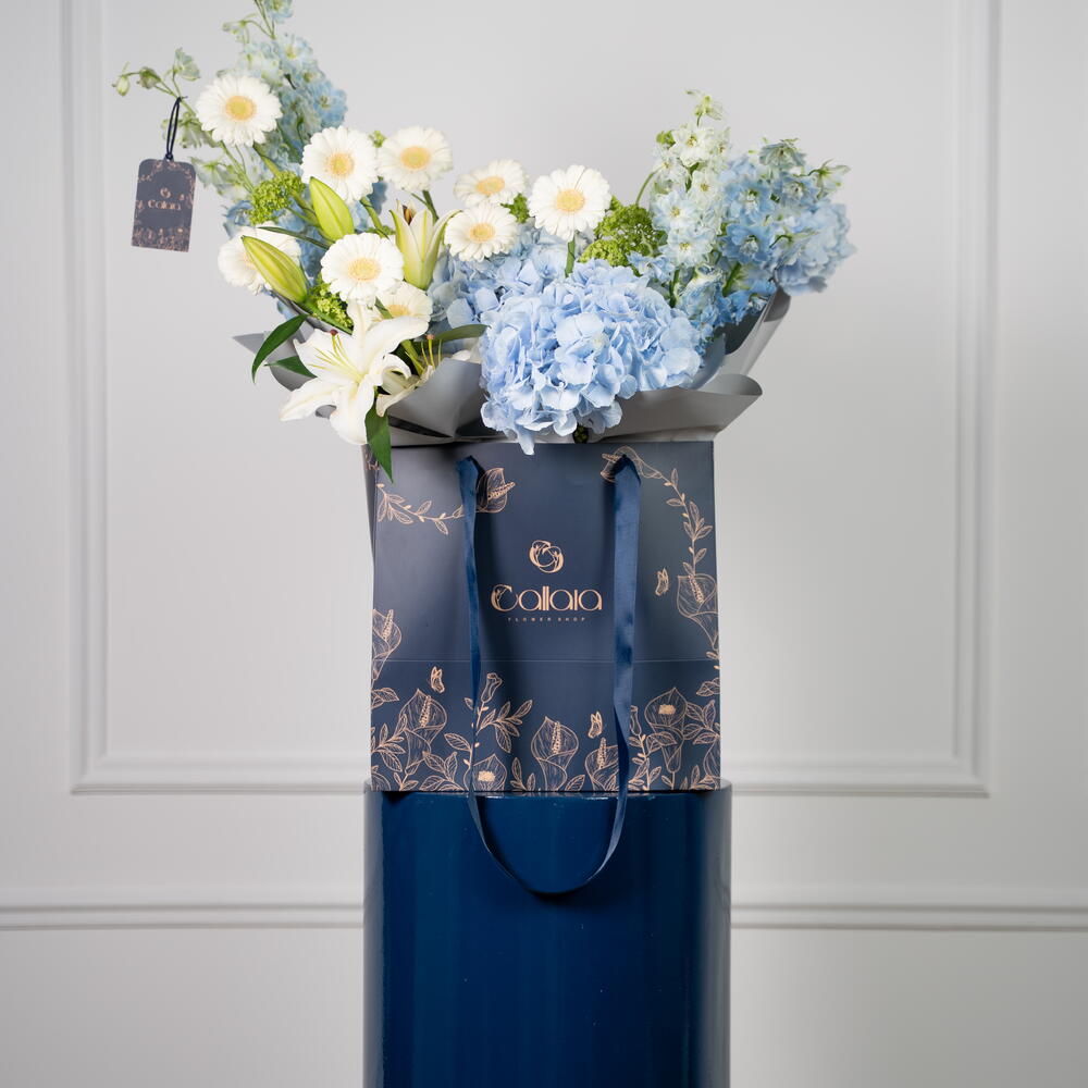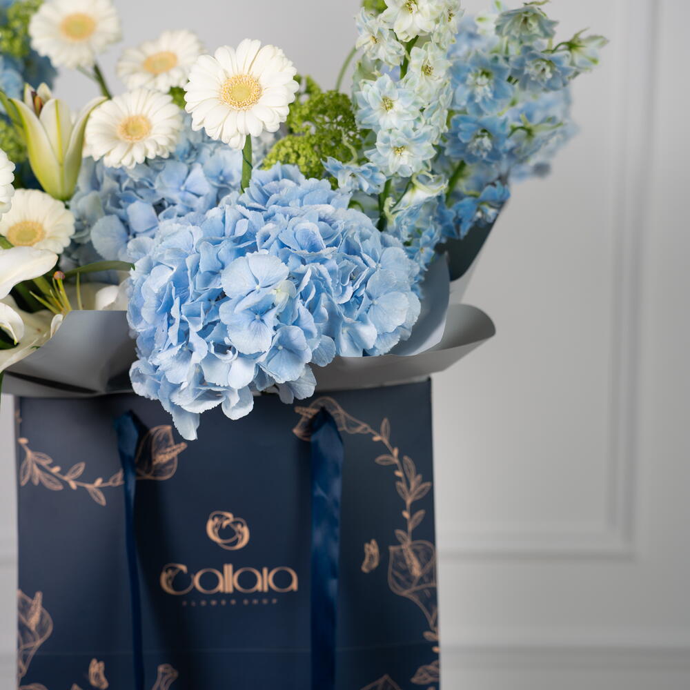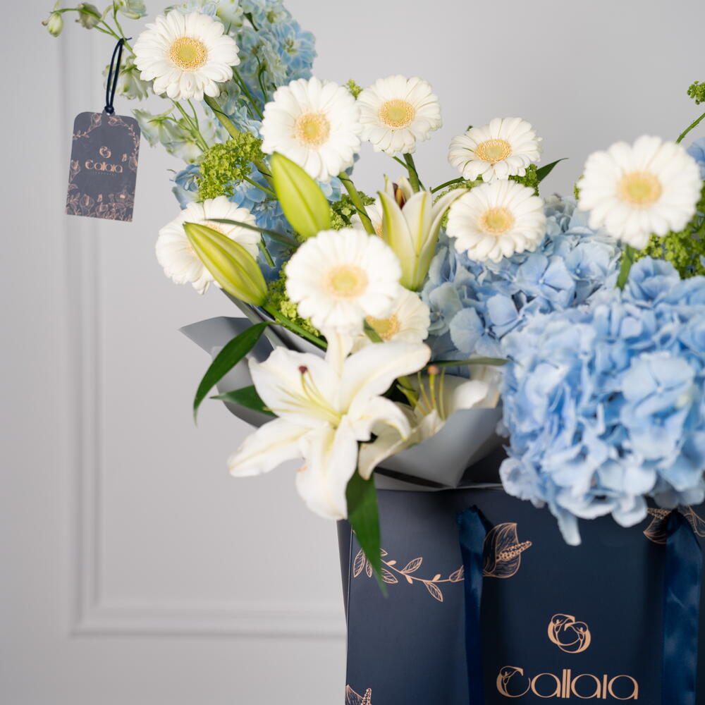 Caelisyn – Blue White Serenity Flower Bag Caelisyn is a graceful arrangement designed to bring peace, freshness, and elegance into any space. Featuring sky-blue delphiniums, crisp white germini daisies, soft blue hydrangeas, fresh lilies, and viburnum, this bouquet captures the beauty of the sky and sea in one stunning gift. Arranged in Callaia’s luxury signature bag, it’s perfect for meaningful occasions and stylish gestures.
