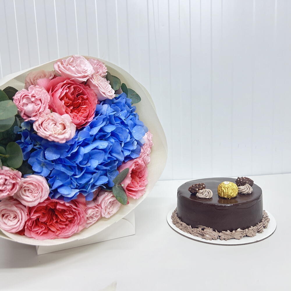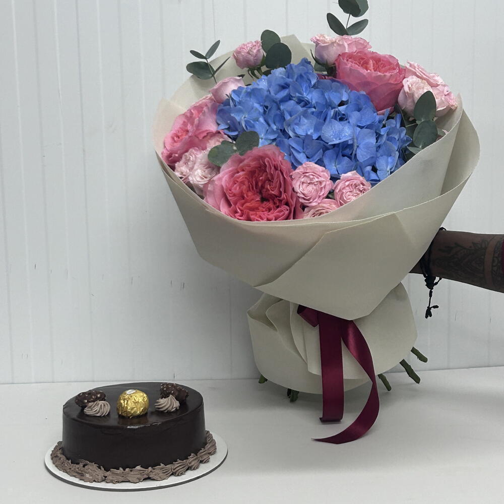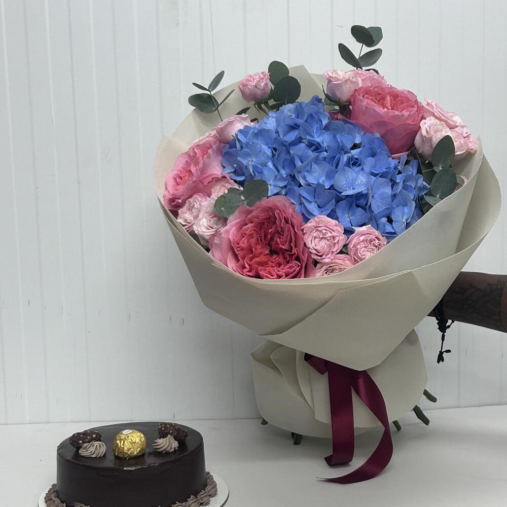 blue hydrangea - 1 pcs wrapping paper - 3 pcs pink expression - 3 pcs bombastic spray rose - 3 pcs eulcyptus - 4 pcs ferroro chocolate cake 500 grams - 1 pcs