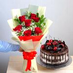 Indulge in a perfect blend of romance and decadence with our Black Forest Cake with Roses Bouquet — a gift set crafted to delight both the heart and the taste buds. Featuring a luscious chocolate sponge cake layered with whipped cream and cherries, paired with a stunning bouquet of fresh roses, this combo is the ultimate celebration of love and sweetness. Ideal for birthdays, anniversaries, or surprise gestures, it’s a timeless duo that never fails to impress. Includes: 1 Black Forest Cake (freshly made, approx. 0.5 kg) A hand-tied bouquet of 7 fresh roses Symbolizes: Passion, celebration, and heartfelt joy Perfect for: Romantic surprises, special occasions gifting moments Same-day delivery available across Dubai Celebrate with charm and flavor — only with Carmel Flowers.