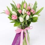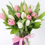 pink tulips - 11 pcs white tulips - 10 pcs single ruscus stems - 3 pcs cylinder vase and a pink ribbon bow - 1 pcs
